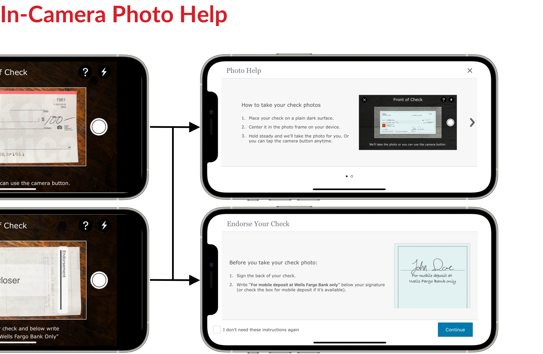 To address this, we proposed, designed, and tested a full-screen overlay that appeared during the photo capture process (between the “Front of Check” and “Back of Check” steps). This overlay reminded users to add the required endorsement. For customers familiar with the process, we provided an option to easily dismiss the reminder by selecting a checkbox (“I don’t need these instructions again”).